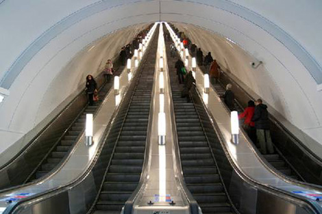 | Hệ thống cầu thang cuốn xuống trạm Admiralteyskaya. Đây là metro có độ sâu sâu nhất thế giới. |