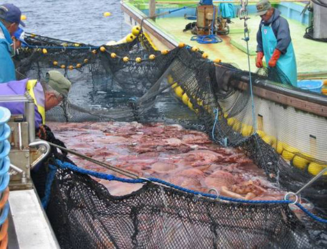 | Ngư dân Nhật Bản kéo lên tấm lưới chứa đầy loài sứa Echizen kurage, hay sứa Nomura. |