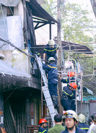 | Căn nhà cháy có lối thoát hiểm bị bịt kín, cảnh sát PCCC phải chuyển thi thể 3 mẹ con chị Liễu ra ngoài bằng đường ban công. |
