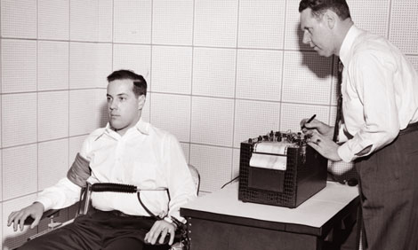| Máy phát hiện nói dối do John Larson, một cảnh sát ở Sở Cảnh sát Berkeley, bang California phát minh năm 1921. Các chỉ số sinh lý học như huyết áp, mạch đập, hiện tượng toát mồ hôi, phản ứng da của một người được đo và ghi lại khi người này được kiểm tra bằng máy phát hiện nói dối. Cơ sở khoa học của máy là nếu nói dối, cơ thể người sẽ có phản ứng sinh lý học khác với người nói thật. |