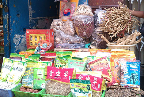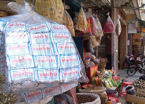 Ninh Vân đã tuyệt chủng cây xáo tam phân từ lâu, nhưng điều lạ là đâu đâu cũng thấy người ta rao bán với số lượng không giới hạn. Trong ảnh là một quầy đông dược ở quận 5 rao bán thứ gọi là "cây thần dược" Ninh Vân. |
