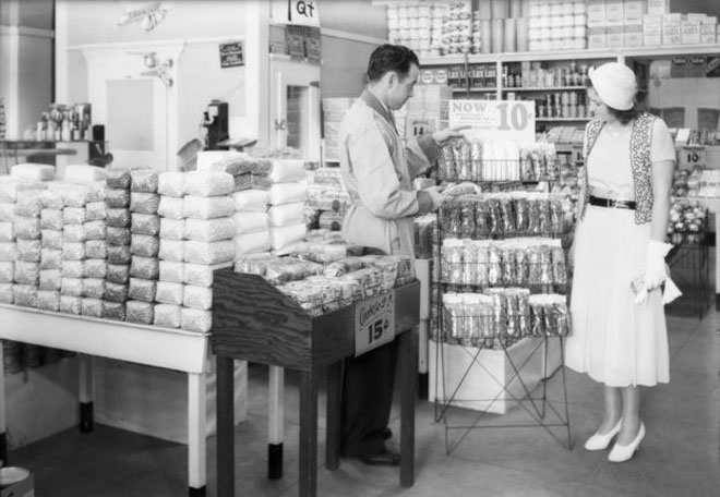 Vào thập niên 1930, các siêu thị bắt đầu thay đổi - khách hàng không còn xếp hàng để nói với trợ lý cửa hàng về những thực phẩm họ cần.