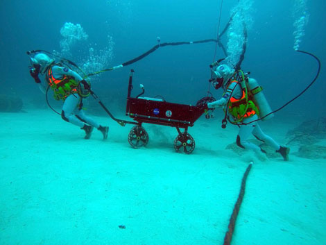 | Thợ lặn và các phi hành gia phải chống lại dòng nước để vận chuyển thiết bị của họ xuống tới nơi làm việc ở độ sâu 24m. Ảnh nguồn: Csilla Ari Dagostino. |