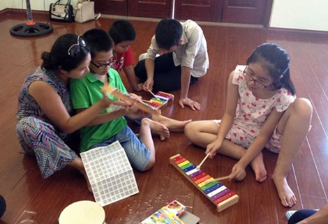 | Nghệ sĩ Nguyệt Thu (bên trái) đang dạy các em chơi nhạc. |