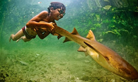 | Tộc người Bajau lặn biển với cây giáo dài để bắt hải sản. |