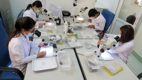 | Nhân viên dự án phân loại các loại muỗi thu được trong môi trường tự nhiên ở thực địa. |