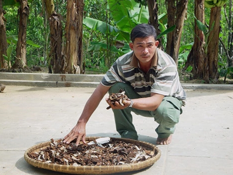 | Anh Nguyễn Đình Hoa đang phơi nấm lim xanh hái trong rừng về thái lát. |