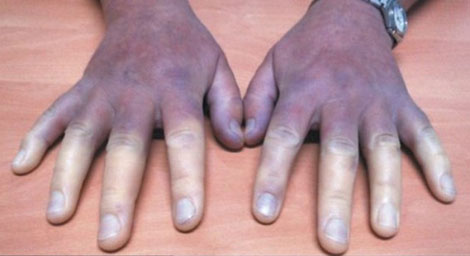 | Bàn tay tê, lạnh, đau buốt, da chuyển màu do thiếu máu nuôi. |