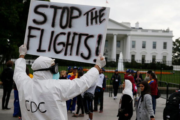 | Một nhân viên CDC giương biểu ngữ trước Nhà Trắng kêu gọi ngưng các chuyến bay đi và đến từ Tây Phi. |