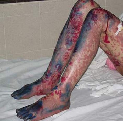 Sau khi uống xong khoảng 6 tiếng, trên mặt và trên người N. xuất hiện những vệt màu hồng nên gia đình đưa N. vào bệnh viện. Tại đây, N. vẫn bị sốt cao, tổn thương hồng ban trên da lan rộng khắp toàn thân, niêm mạc môi miệng lở loét, đau họng, khó nuốt, tiết dịch ở niêm mạc mũi, kết mạc mắt, tiết dịch đường tiết niệu, hậu môn…