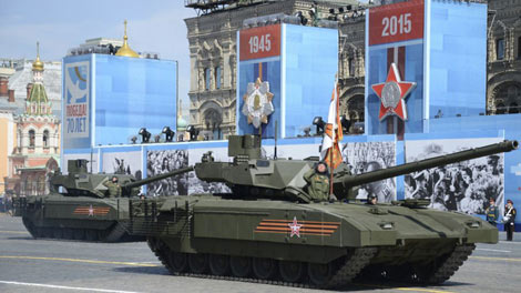 | Xe tăng thế hệ thứ 5 của Nga, T-14 Armata ra mắt trước công chúng lần đầu trong buỗi diễn tập cho lẽ duyệt binh kỷ niệm ngày Chiến thắng tại Mosscow. Nga đã bỏ ra 5 năm để phát triển ra loại xe tăng này, nó có thiết kế mang tính cách mạng khi sử dụng một tháp pháo hoàn toà tự động, khẩu pháo chính 125mm có thể bắn với tốc độ 10 -12 phát/phút. |