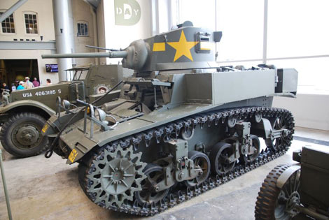| Xe tăng hạng nhẹ M3 hay còn có tên là Stuart, chiếc xe tăng đầu tiên của Mỹ tham gia vào các cuộc đấu tăng trong Thế chiến II. Khoảng 170 chiếc Stuarts đã được sử dụng tại mặt trận Bắc Phi, tại đây nó lộ ra nhược điểm là hoả lực yếu khi chỉ có vũ khí chính là một khẩu 37mm đồng nội thất được bố trí không hợp lý. Stuarts sau đó nhận vai trò là xe tăng chính sát. Chiếc Stuarts trong ảnh đang hiện diện tại Bảo tàng Thế chiến II ở New Orleans, Mỹ. |