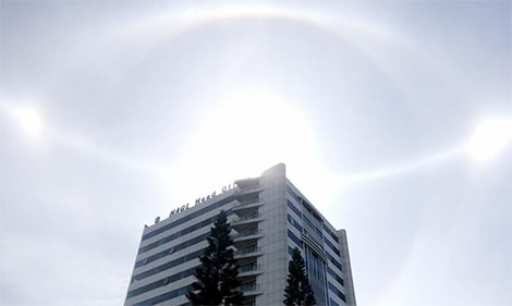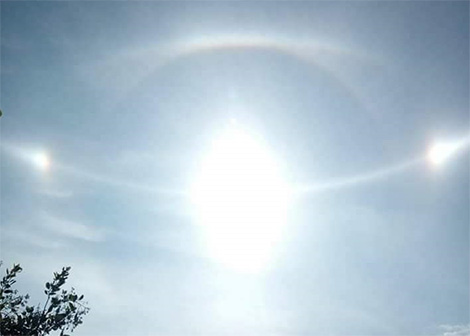 Cụ thể, tâm điểm của hiện tượng là mặt trời được nhìn thấy thành “chùm sáng trắng lớn”, ở phía hai bên trái phải là “hai mặt trời nhỏ” cùng được bao bọc bởi nhiều quần sáng trắng xung quanh. Hiện tượng này được người dân dùng camera điện thoại ghi lại.