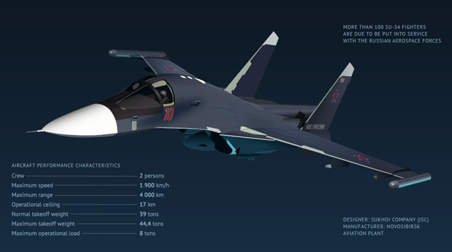 Cuộc chiến tại Syria trở thành một màn quảng bá hình ảnh cho các loại vũ khí mới của Nga trong đó có Su-34. Được xếp vào loại máy bay thế hệ 4++, Su-34 được chế tạo dựa trên cơ sở của máy bay chiến đấu Su-27 và dự kiến sẽ thay thế vai trò của những chiếc Su-24 của không quân Nga.