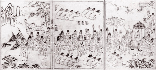| Mạc Đăng Dung trở về Thăng Long (An Nam lai uy đồ sách [1571] 1988). |