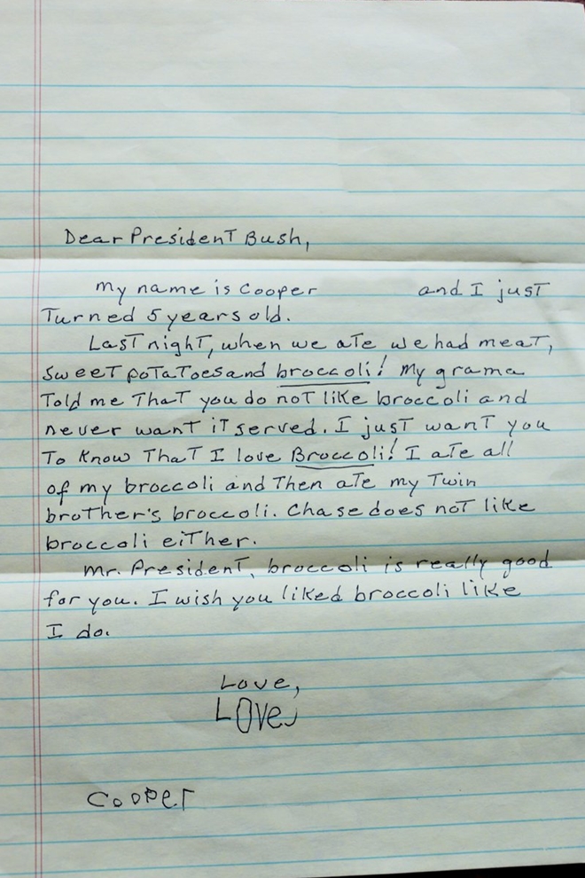 | Bức thư cậu bé Cooper khuyên ông Bush ăn bông cải xanh sau đó được đưa lên mạng xã hội. |