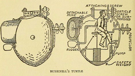 Mùa xuân năm 1776, chiếc tàu ngầm chiến đấu đầu tiên trên thế giới ra đời. Nó cao 2m, đường kính thân chỗ rộng nhất là 0,9m, để phục vụ kíp chiến đấu dự tính duy nhất chỉ 1 người - người thực hiện tất cả các nhiệm vụ, mang tất cả các chức danh: Thuyền trưởng, lái tàu, hoa tiêu, thợ máy, thủy thủ chiến đấu…