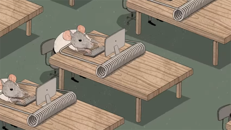 Những con chuột mặc áo sơ mi, đeo caravat, đi siêu thị, uống rượu, bán mạng vì tiền - y như con người - và ở đoạn cuối, Cutts lồng vào hình ảnh đáng giá nhất, gây choáng nhất: những con chuột san sát cạnh nhau, mỗi con bị kẹp đầu trong một chiếc bẫy chuột gắn trên bàn, với màn hình máy tính trước mặt, bọn chuột gõ liên hồi và gõ điên cuồng. Đó là định nghĩa về hạnh phúc trong thời đại này: một công việc an nhàn, sạch sẽ và có vẻ sang chảnh trong văn phòng điều hòa mát rượi. Chỉ là, hạnh phúc đôi khi cũng là cái bẫy.