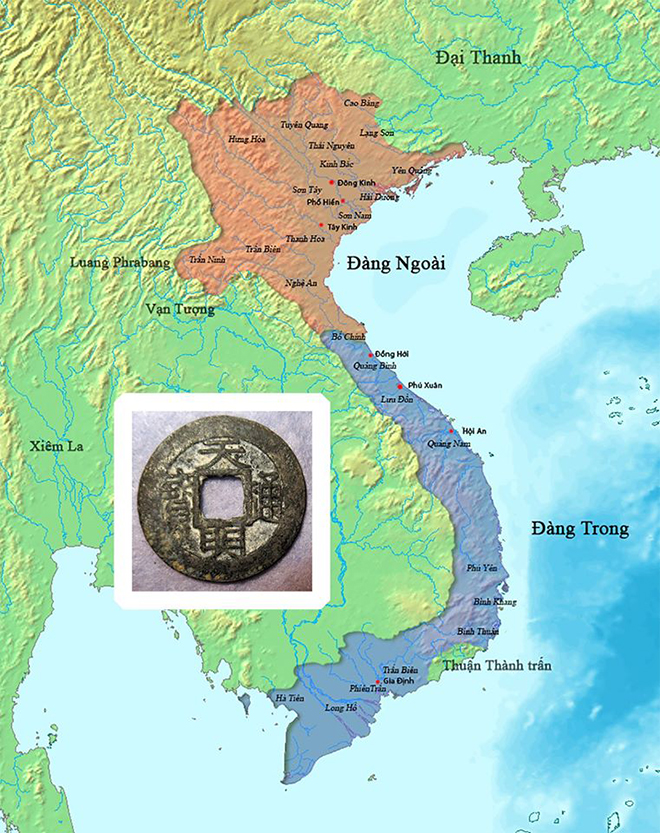 “Phủ Biên Tạp Lục” của Lê Quý Đôn chép: “Hai xứ Thuận Quảng không có mỏ đồng. Nước Nhật-bản thổ sản đồng đỏ. Mỗi năm có tàu người Nhật đến, họ Nguyễn mua mỗi 100 cân đồng giá cổ tiền (tiền cũ) 45 quan... Lâu ngày, những kẻ có quyền thế xin mở lò, đến hơn 100 lò đúc, tiền ấy gọi là Thiên minh thông bảo, nấu lẫn thứ thiếc xấu, ngày càng nhỏ và mỏng, nhân dân chê thứ tiền ấy không mua bán được”.