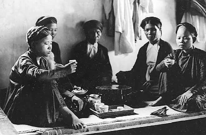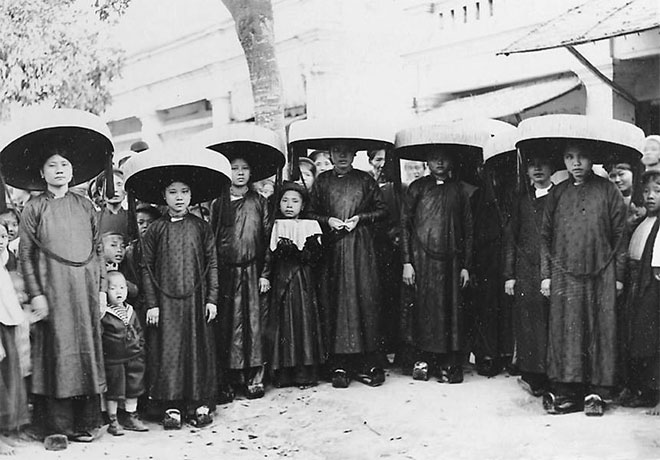 | Phụ nữ thời xưa với áo tứ thân, nón quai thao, guốc rễ tre, tóc vấn. |