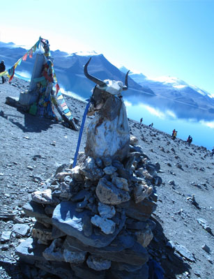 | Những bộ đầu và xương thú vật được dựng bên bờ hồ, như một nghi thức tử tế với những người đã khuất ở Tây Tạng. |