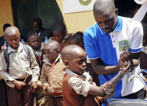 Học sinh tiểu học ở Nigeria được hướng dẫn rửa tay đề phòng dịch Ebola.
