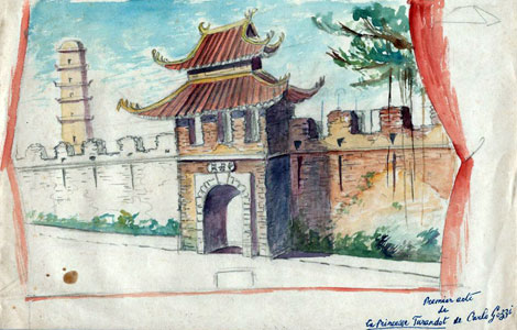 | Phác họa trang trí cho vở "Công chúa Turandot" do C. Bourrin dàn dựng tại Nhà hát Lớn Hà Nội năm 1926. |