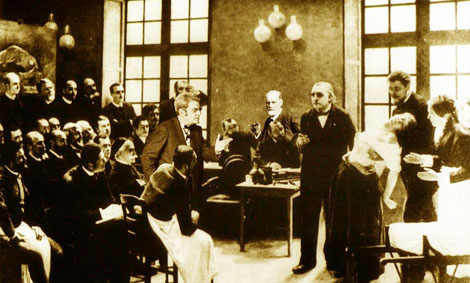 Nhà tâm thần học, giáo sư Jean M. Charcot ủng hộ việc sử dụng thôi miên như là một phương pháp để trị chứng rối loạn cảm xúc. Trong ảnh: Một buổi giảng bài của giáo sư Charcot có sự hiện diện của một nữ bệnh nhân.