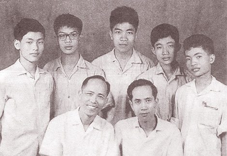 Vũ Đình Hòa (đeo kính) cùng các thầy và thành viên đội tuyển Việt Nam tham dự Olympic Toán quốc tế năm 1974.
