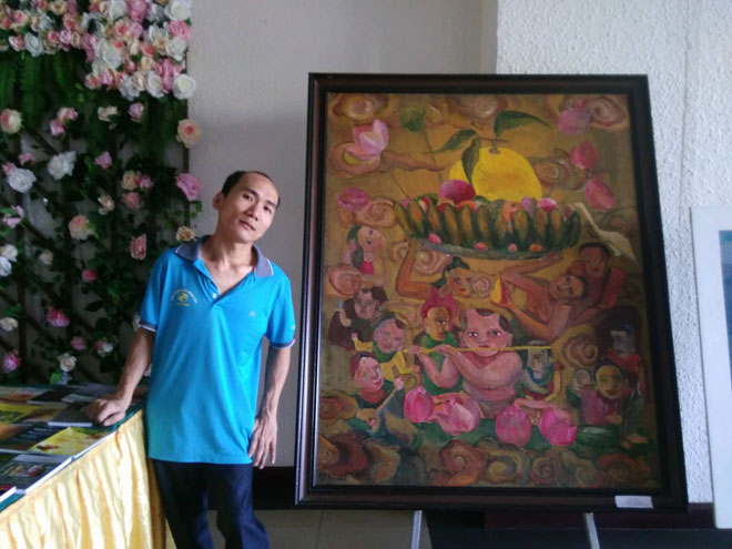 | Lê Quang Lĩnh bên tác phẩm triển lãm của mình. |