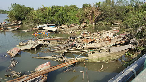 | Tang vật khai thác cát trái phép được trục vớt nằm ngổn ngang tại chân cầu Long Thuận, phường Long Phước. |