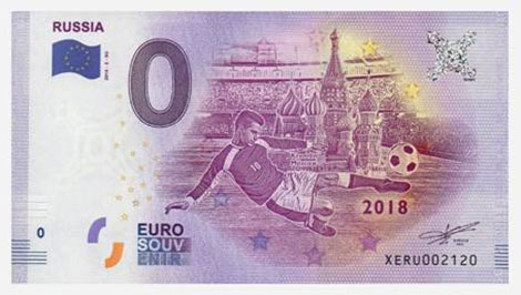 2. Đầu năm 2018, Ngân hàng Trung ương châu Âu cũng phát hành một số giấy bạc kỷ niệm World Cup 2018 có mệnh giá 0 euro.