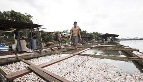 1. Giữa cái tổ hợp mùi gây gây tanh nồng ấy, chị Phạm Thị Ngần vẫn miệt mài bấm chân trên những bản gỗ mong manh của bè cá, dùng vợt vớt xác cá đóng vào bao tải để đem đi chôn. Từ 3 giờ sáng đến giờ, vợ chồng chị Ngần, anh Quyết và người con trai cả 18 tuổi vẫn chưa có một hạt cơm vào bụng. Tất tả lo cứu cá, tất tả lo vớt xác cá để tránh gây ô nhiễm cho số cá còn sót lại, tất tả sục khí để cá có ôxy thở…