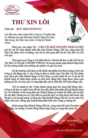 Thay vì có văn bản phúc đáp, trước các cảnh báo của nhiều cơ quan, tổ chức như kể trên, lãnh đạo Công ty CP Địa ốc Alibaba đã gửi thư xin lỗi. Ông Nguyễn Thái Luyện, Chủ tịch Hội đồng quản trị Công ty CP Địa ốc Alibaba, tự xưng là “CEO cùi bắp” đã gửi lời xin lỗi tới khách hàng, đối tác về những việc ồn ào tại dự án Tây Bắc Củ Chi.