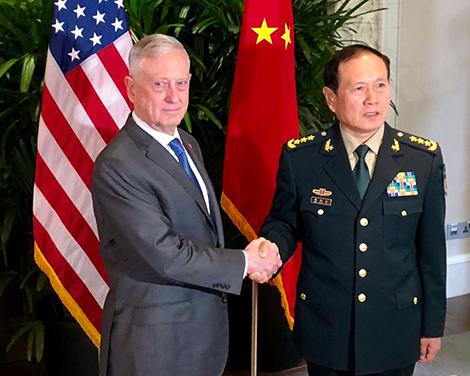 | Bộ trưởng Quốc phòng Mỹ và Bộ trưởng Quốc phòng Trung Quốc. Ảnh: Stars and Stripes. |