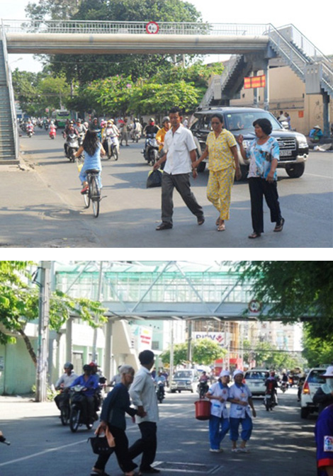 Vắng tanh. Mòn mỏi đợi người đi qua, là tình trạng bất ổn chung đã và đang diễn ra hầu hết ở các cầu bộ hành hiện nay. Quan sát cầu vượt bộ hành bệnh viện Bình Dân (Điện Biên Phủ, Q3), cầu bộ hành bệnh viện Từ Dũ (đường Cống Quỳnh, Q1), cầu bộ hành bệnh viện Nguyễn Tri Phương (đường Nguyễn Trãi, Q5) và cầu vượt bệnh viện Ung Bướu - Bệnh viện Nhân dân Gia Định (đường Nơ Trang Long, Q. Bình Thạnh) dù đang giờ cao điểm buổi sáng, nhưng chỉ lèo tèo vài người qua lại và hình như là đang ăn điểm tâm, nhân tiện ngắm đường phố đông người lưu thông.