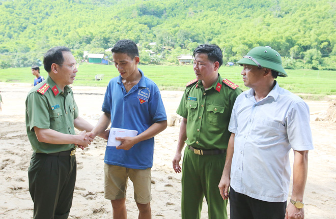 Trong hai ngày 6 và 7-8, từ Hà Nội, Đoàn công tác xã hội từ thiện của Cục Truyền thông CAND do Đại tá Trần Thanh Phong, Phó Cục trưởng, Phó Tổng Biên tập Báo CAND làm Trưởng đoàn cùng đại diện các nhà hảo tâm đã vượt qua đoạn đường gần 500km để đến thăm hỏi, động viên người dân gặp nạn do lũ dữ ở huyện Quan Sơn và huyện Mường Lát (Thanh Hoá).