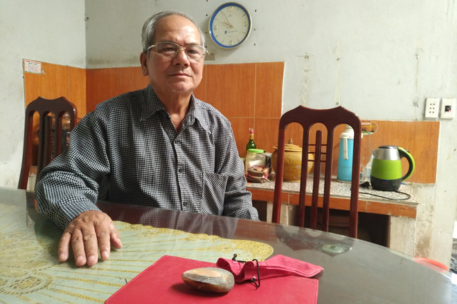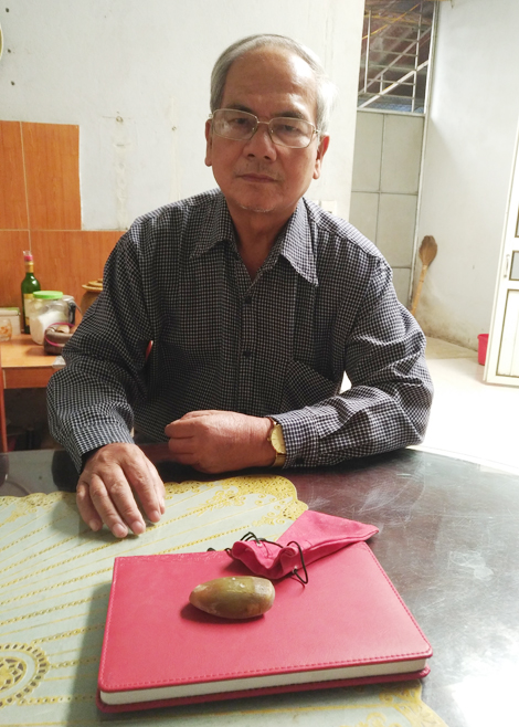| Ông Hà Công Mậu bên mẩu sừng tê giác gia bảo. |
