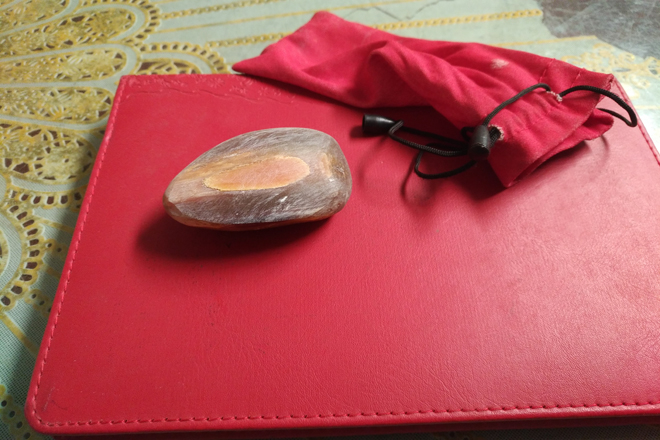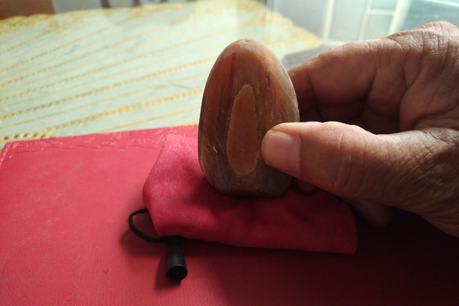 Hết hai tuần trà, ông Mậu đứng dậy đi vào nhà trong. Một lúc sau ông vẫy hai chúng tôi vào theo. Trịnh trọng lấy ra một chiếc túi vải màu đỏ, có dây rút ở miệng, ông từ từ trút ra một mẩu sừng bằng nửa quả trứng gà luộc có màu khá đẹp. "Mảnh sừng tê giác đây. Không biết lúc nguyên vẹn thì nó to nặng như thế nào, giờ chỉ còn nhỏ vậy thôi. Chắc trước đây các cụ cũng mài đi ít nhiều. Theo lời các cụ truyền lại, đến nay nó cũng đã được gần 500 năm tuổi rồi", ông Mậu khẳng định.