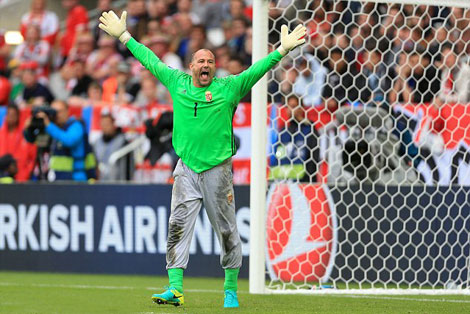 | Thủ môn Gabor Kiraly ra sân với chiếc quần dài lập dị. |