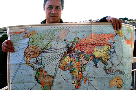 | Jorge và tấm bản đồ biểu thị những nơi ông đã từng đặt chân đến. |
