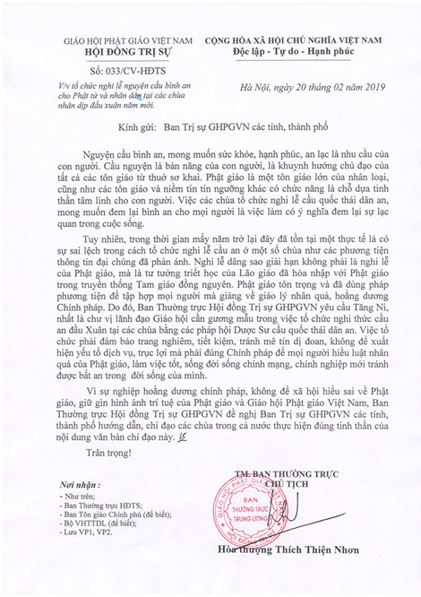 | Công văn của Hội đồng Trị sự - Giáo hội Phật giáo Việt Nam về tổ chức nghi lễ nguyện cầu bình an. |