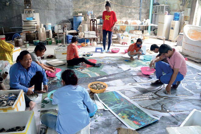 | Họa sĩ Nguyễn Hồng Tân miệt mài bên sản phẩm của mình. |