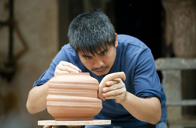 Anh mân mê, ngắm nghía từng chiếc lọ với vẻ trầm trồ thán phục lộ rõ trên mặt về cách tạo dáng và nước men độc đáo, trong lúc tôi ngơ ngác không hiểu lý do. Thú thật, nhìn những chai, lọ, bát, đĩa, lọ lục bình cùng nhiều sản phẩm khác, tôi thấy... không đẹp bằng những đồ gốm vẫn bán đầy ở các cửa hàng trên phố hay tại “thủ phủ” sành sứ Bát Tràng.