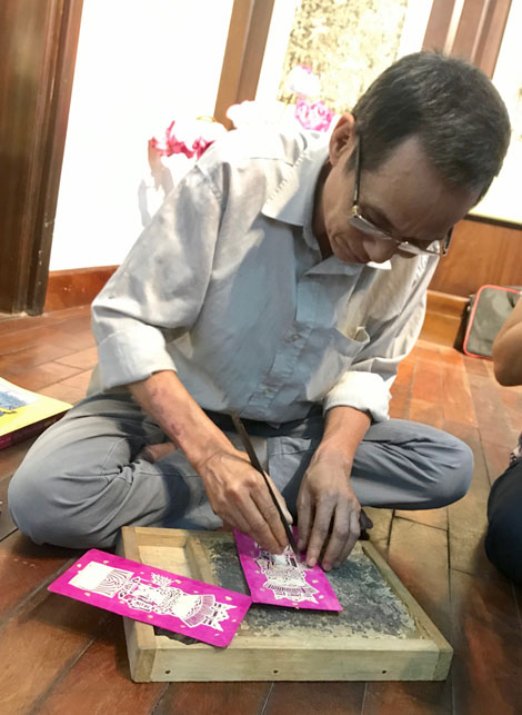 | Nghệ nhân Nguyễn Đăng Giáp làm tranh trổ giấy. |