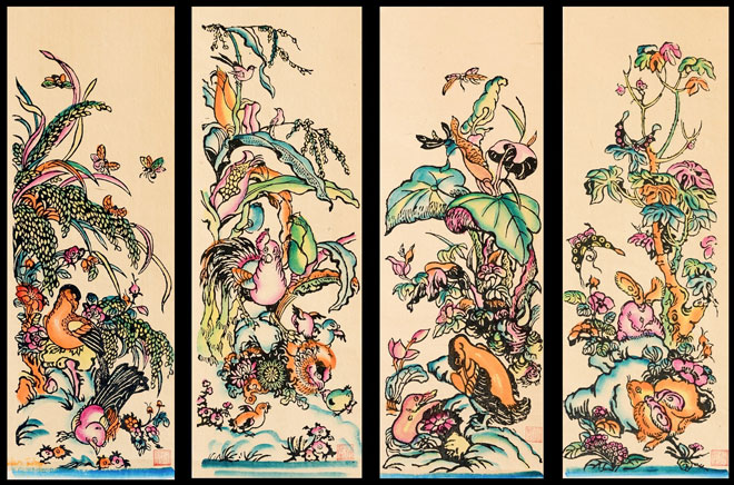 | Bộ tranh tứ bình “Lúa Ngô Khoai Sắn” của nghệ nhân Nguyễn Đăng Sần mang đậm chất dân gian. |