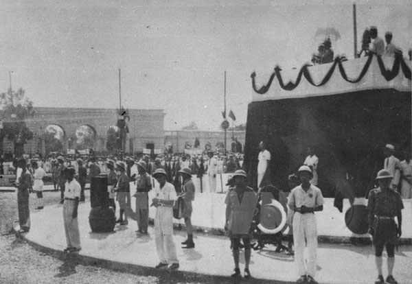 | Đồng chí Phạm Gia Đốc (người mặc áo trắng, thứ 2 từ phải sang) bảo vệ dưới đài Độc Lập. |
