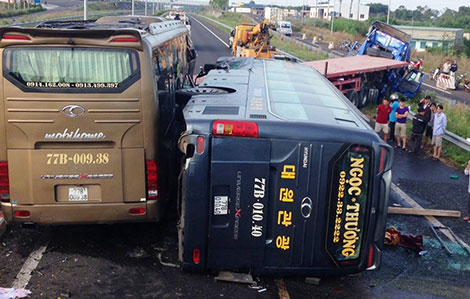 Xe khách 77B-010.40 do tài xế Cao Đình Tân (SN 1972, quê Bình Định) điều khiển đâm vào xe container khiến xe này lật ngang lao về phía lan can đường, phần đầu xe khách vỡ nát. Có 17 người bị thương, trong đó có 5 người bị thương nặng đang cấp cứu và đã có 1 người tử vong sau khi chuyển lên BV Chợ Rẫy cấp cứu sáng cùng ngày.
