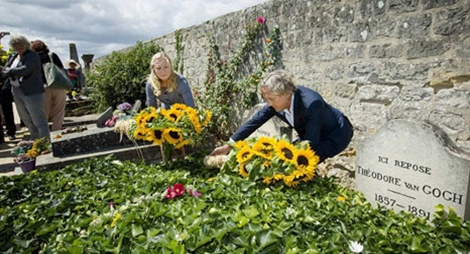 | Hậu duệ của Van Gogh chăm sóc mộ phần của danh họa ở Auvers-sur-Oise (miền bắc nước Pháp) vào ngày 29-7-2015. |