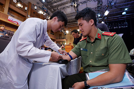 Hàng ghế dành cho người hiến máu chạy dài hết sân khấu không còn chỗ trống. Bóng dáng các y, bác sĩ thuộc Trung tâm Huyết học - Truyền máu, Bệnh viện 19-8 (Bộ Công an) tất bật di chuyển trên sân khấu để tổ chức lấy máu và hướng dẫn, động viên người tham gia hiến máu.